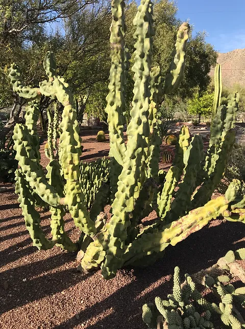 Stems: The defining feature is the thick, columnar stems with a bumpy and contorted appearance. These stems are typically green but can have a grayish hue.